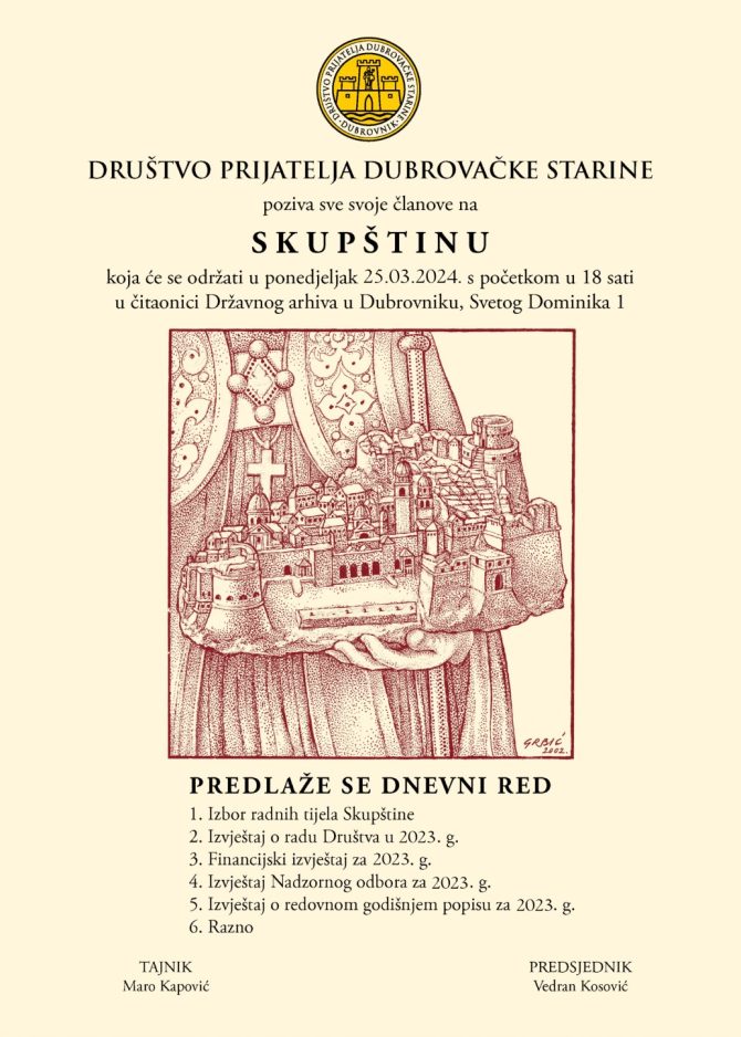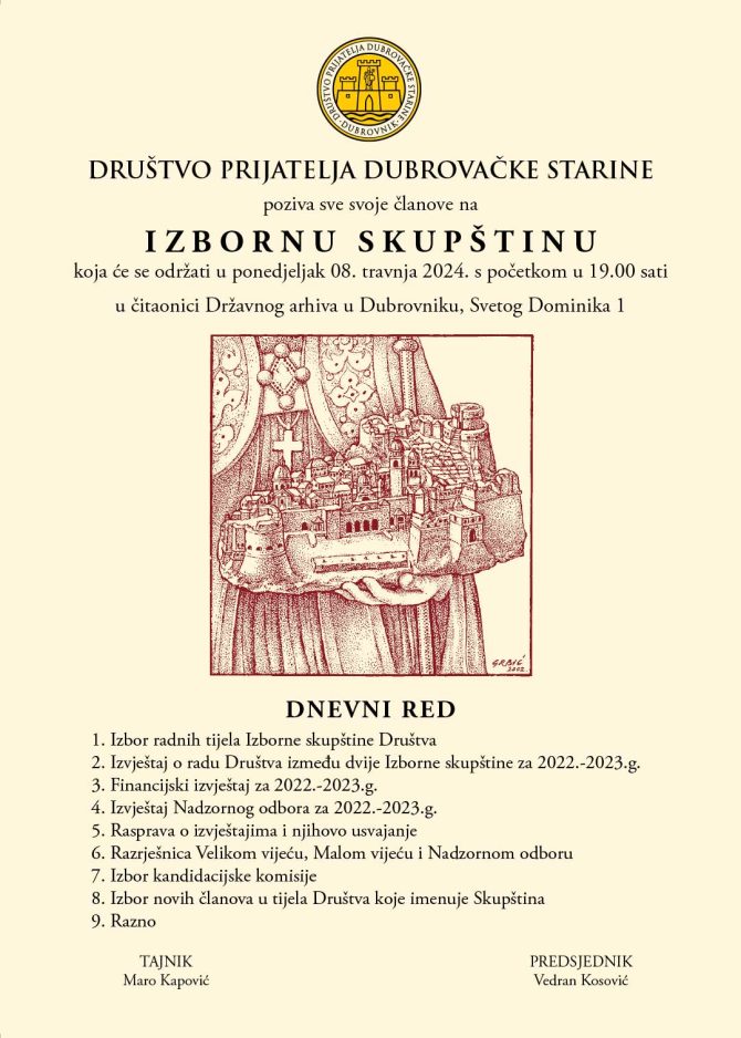 Skupština Društva prijatelja dubrovačke starine održana je večeras u 18 sati, u čitaonici Državnog arhiva u Dubrovniku. Nakon provedenog izlaganja sve točke dnevnog reda Skupštine su jednoglasno prihvaćene, a usvojeno je sljedeće: Financijski izvještaj Društva za 2022. godinu, Izvještaj o radu Društva za 2022. godinu, Izvještaj Nadzornog odbora za 2022. godinu te Izvještaj o redovnom…