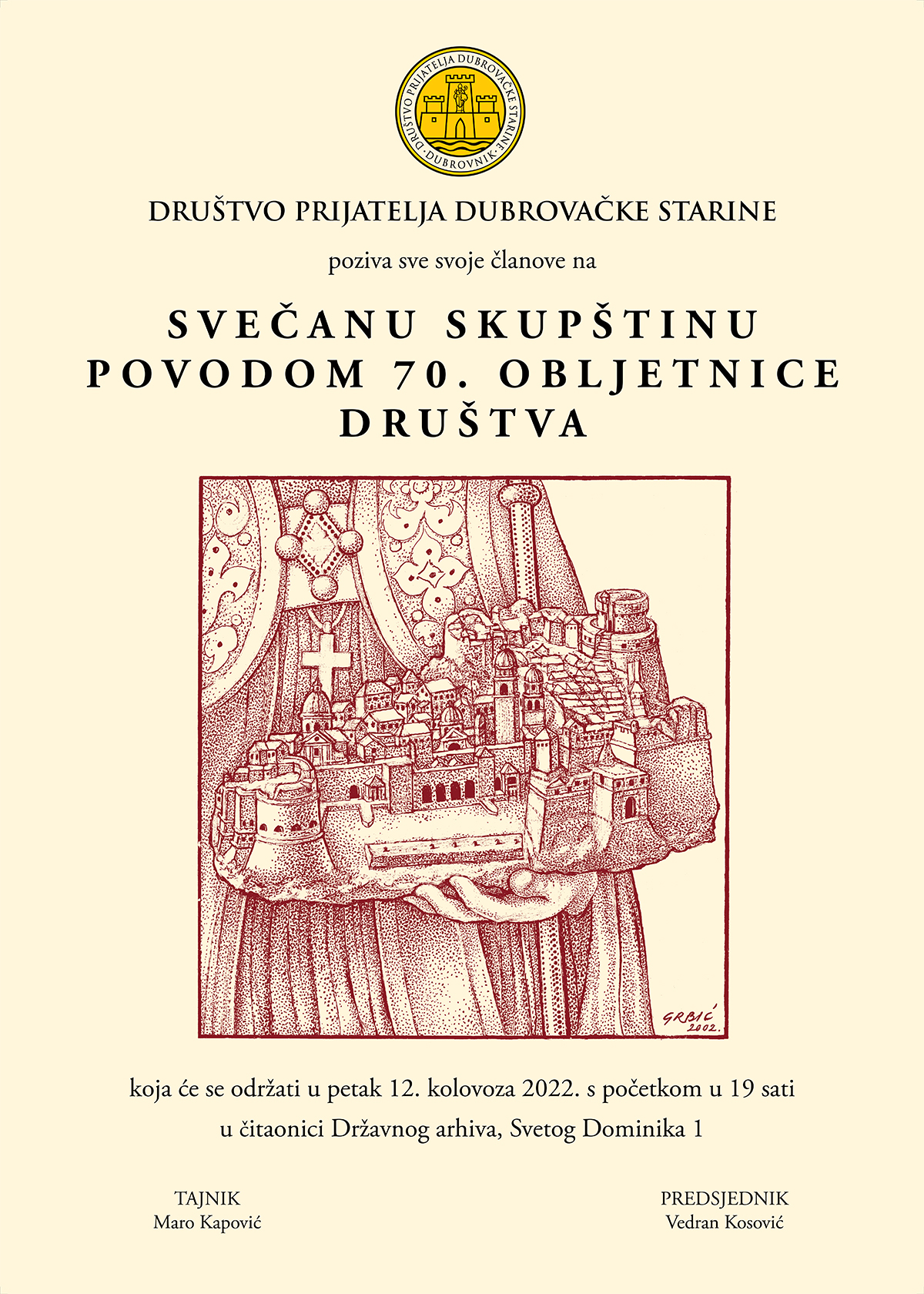 poziva sve svoje članove na Svečanu skupštinu povodom 70. Obljetnice društva koja će se održati u petak 12. kolovoza 2022. s početkom u 19 sati u čitaonici Državnog arhiva, Svetog Dominika 1. Radujemo se Va[em dolasku